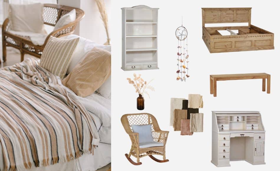 Die Zutaten dafür bauen auf dem Grundprinzip auf: Farben der Beach House Palette wählen, bodenlange Leinen- oder Baumwollstores und gezielt gewählte Möbel. Auch hier gibt es mehrere Möglichkeiten. Rattanbetten greifen das natürliche Gefühl gekonnt auf, hier gerne auf gedeckte Töne zurückgreifen wie Seegras oder Kuburattan, da die Grautöne besonders naturnah wirken und Ruhe ausstrahlen. Kombiniert mit Leinenbettwäsche schafft man eine Ton-in-Ton-Kombination, die besonders einladend wirkt und Ruhe ausstrahlt. Dazu passen Schränke und Kommoden in hellem Holz wie beispielsweise Eiche oder Parota.