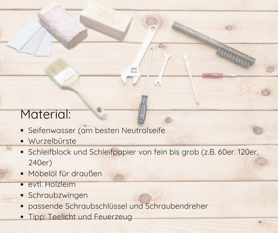 Um auch an die schwer zugänglichen Stellen zu kommen, lohnt es sich, die Gartenmöbel auseinanderzubauen. Sammeln sie die Schrauben, reinigen Sie auch diese gründlich und tauschen Sie beschädigte Schrauben aus.