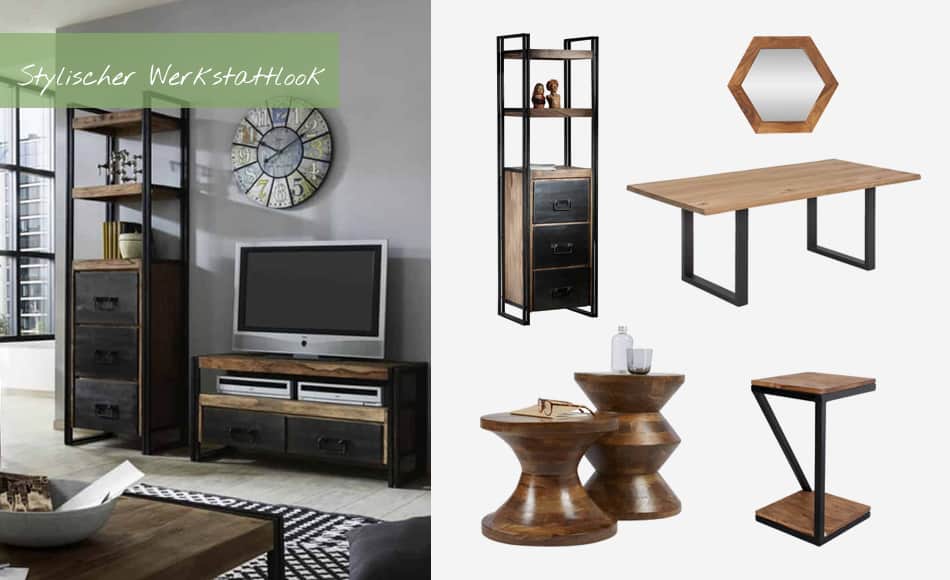 Auch Esstische wie der beliebte Baumkantentisch ziehen auch in einer Loftatmosphäre alle Blicke auf sich. Grundsätzlich lässt sich im Industrie Stil vieles miteinander kombinieren. Geradlinige Schränke aus dunklem Holz mit Eisenschubladen, wie beispielsweise in unserer Serie „Madras“ erinnern an alte Werkstattschränke und Regale. Die stabile und schwere Konstruktion wirkt authentisch und modern zugleich.