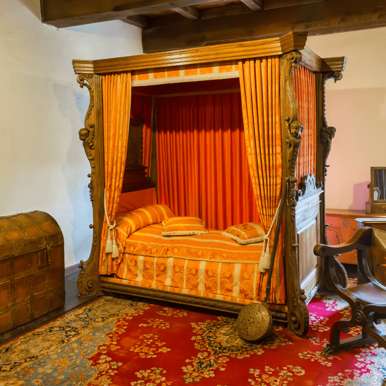 Auch Betten waren im Mittelalter oft in Nischen verbaut, damit sich die Wärme in kalten Tagen besser speichern lässt. Vorhänge vor sogenannten Alkoven sollten diesen Effekt verstärken.